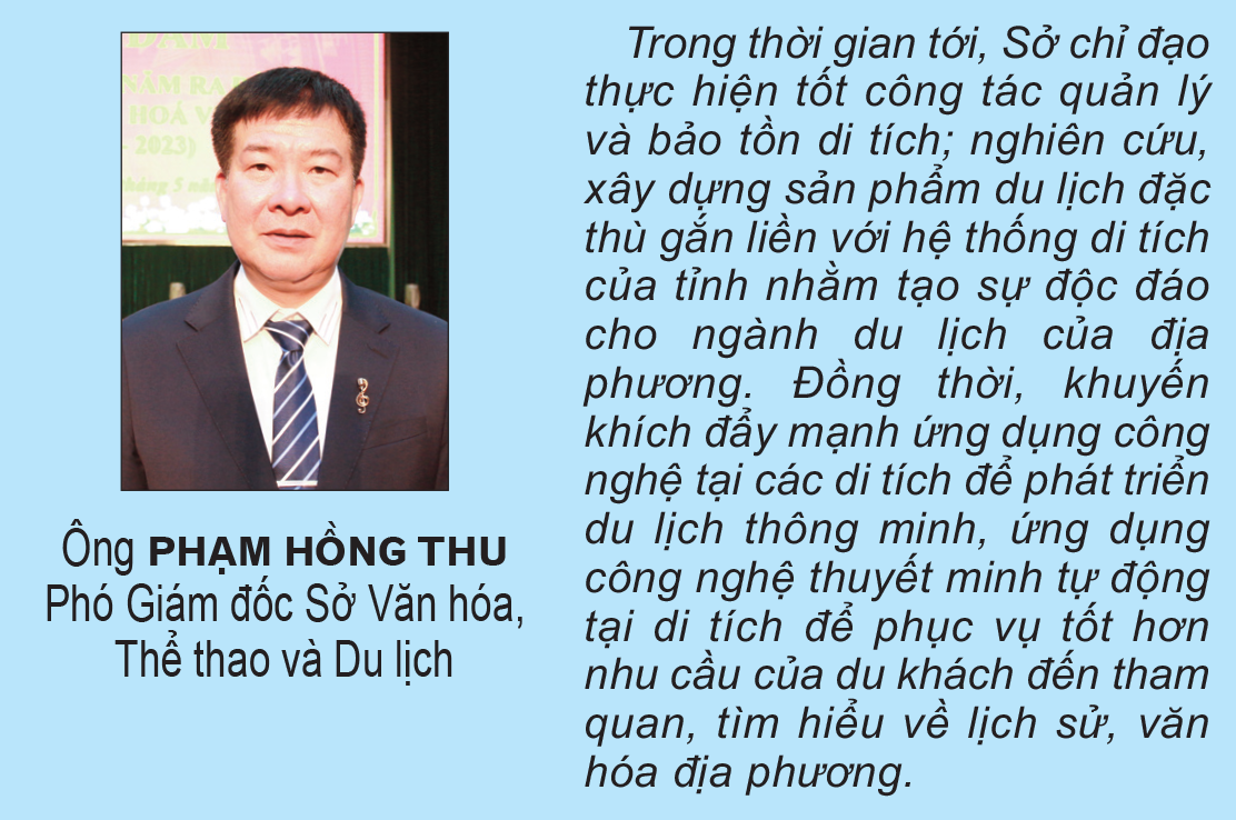 Toàn tỉnh hiện có 65 di tích lịch sử, trong đó có 2 di tích quốc gia đặc biệt, 16 di tích cấp quốc gia, 47 di tích cấp tỉnh. Những năm qua, các ngành, địa phương đã quan tâm triển khai công tác số hóa các di tích, góp phần tăng trải nghiệm của du khách, đưa di tích và những câu chuyện lịch sử, văn hóa đến gần hơn với công chúng.