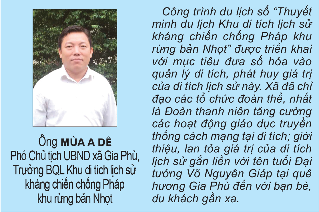 Tại xã Gia Phù, tháng 7/2025, xã đã đưa vào triển khai ứng dụng công trình du lịch số “Thuyết minh du lịch Khu di tích lịch sử kháng chiến chống Pháp khu rừng bản Nhọt”. Chỉ với thao tác quét mã QR, nhân dân, du khách khi đến đây có thể đọc và nghe thuyết minh từ nguồn gốc tên gọi di tích, về rừng bản Nhọt gắn với Đại tướng Võ Nguyên Giáp cho đến công trình Đền thờ Đại tướng hiện nay. Việc ứng dụng công nghệ này đã và đang giúp ích hiệu quả cho công tác quản lý, hỗ trợ nhân dân, du khách khi đến di tích và thiết thực góp phần số hóa di tích.