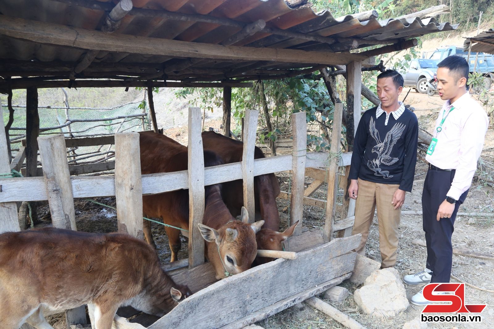 Cán bộ Phòng giao dịch NHCSXH Sốp Cộp kiểm tra hiệu quả vốn vay của đối tượng chính sách.