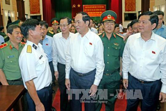 Giải đáp các ý kiến của cử tri, Chủ tịch nước Trần Đại Quang khẳng định, việc tăng cường thực hiện nhiệm vụ quốc phòng - an ninh chính là yếu tố tiên quyết để triển khai tốt mục tiêu phát triển kinh tế - xã hội, hội nhập quốc tế của đất nước; đi cùng với đó là công tác giáo dục kiến thức quốc phòng - an ninh cho các cấp, các ngành và tất cả người dân. Chủ tịch nước nhấn mạnh, nhiệm vụ bảo vệ Tổ quốc trong tình hình mới đang đặt ra những yêu cầu mới, đòi hỏi lực lượng vũ trang nhân dân phải chuẩn bị tốt về mọi mặt, sẵn sàng chiến đấu cao, bảo vệ vững chắc chủ quyền, thống nhất, toàn vẹn lãnh thổ của Tổ quốc, không để bị động trong bất cứ tình huống nào. Đây là nhiệm vụ trọng yếu, thường xuyên của cả hệ thống chính trị và toàn dân, trong đó lực lượng vũ trang là nòng cốt. “Mục tiêu trọng yếu của quốc phòng - an ninh là: Phát huy mạnh mẽ sức mạnh tổng hợp của toàn dân tộc, của cả hệ thống chính trị, tranh thủ tối đa sự đồng tình, ủng hộ của cộng đồng quốc tế, kiên quyết, kiên trì đấu tranh bảo vệ vững chắc độc lập, chủ quyền, thống nhất, toàn vẹn lãnh thổ của Tổ quốc, bảo vệ Đảng, Nhà nước, nhân dân và chế độ xã hội chủ nghĩa; bảo vệ công cuộc đổi mới, sự nghiệp công nghiệp hóa, hiện đại hóa, bảo vệ lợi ích quốc gia - dân tộc, giữ vững môi trường hòa bình, ổn định chính trị, an ninh ninh quốc gia, trật tự, an toàn xã hội”, Chủ tịch nước khẳng định.