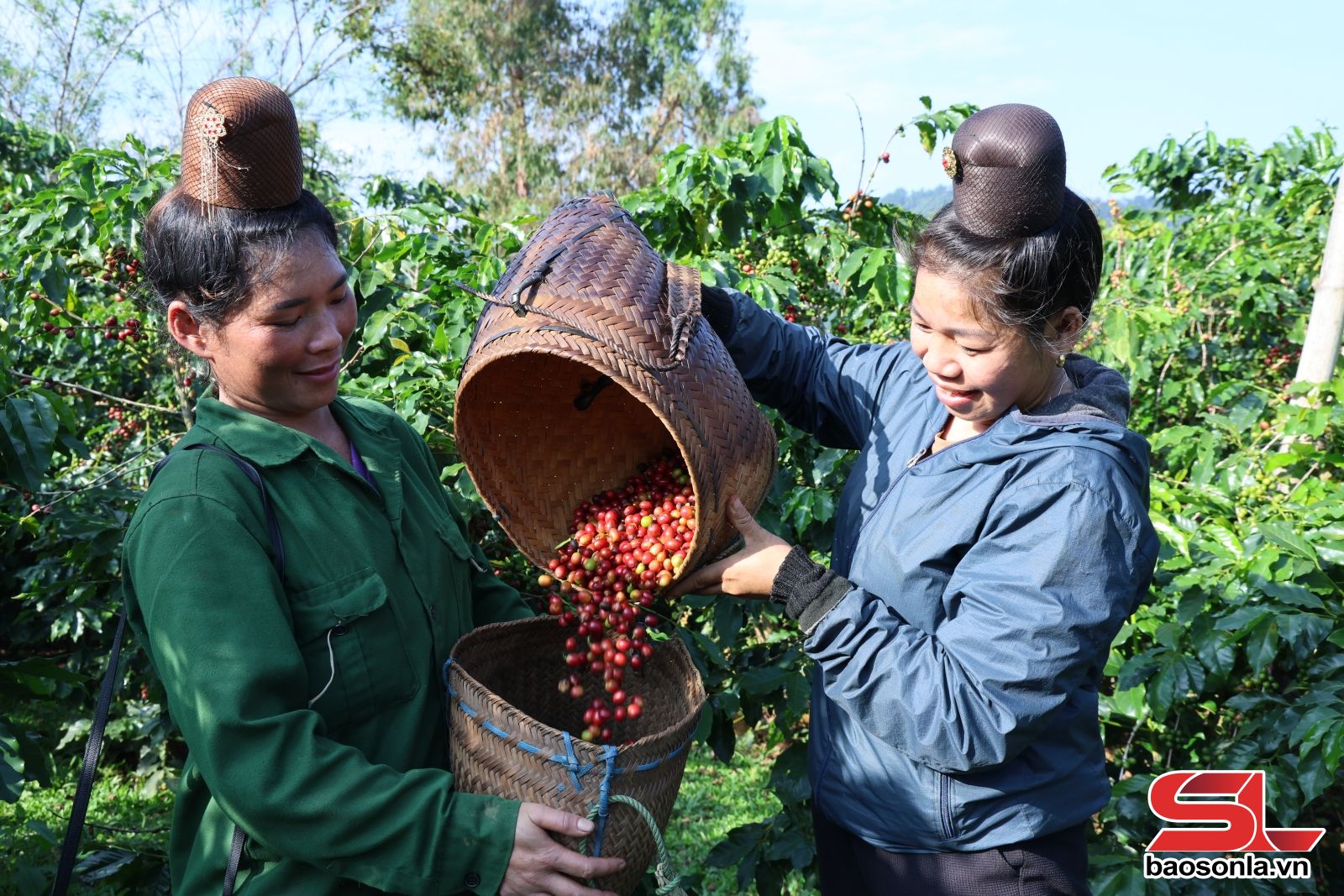 Nhân dân bản Ten Hịa, xã Mường Chanh thu hái cà phê.
