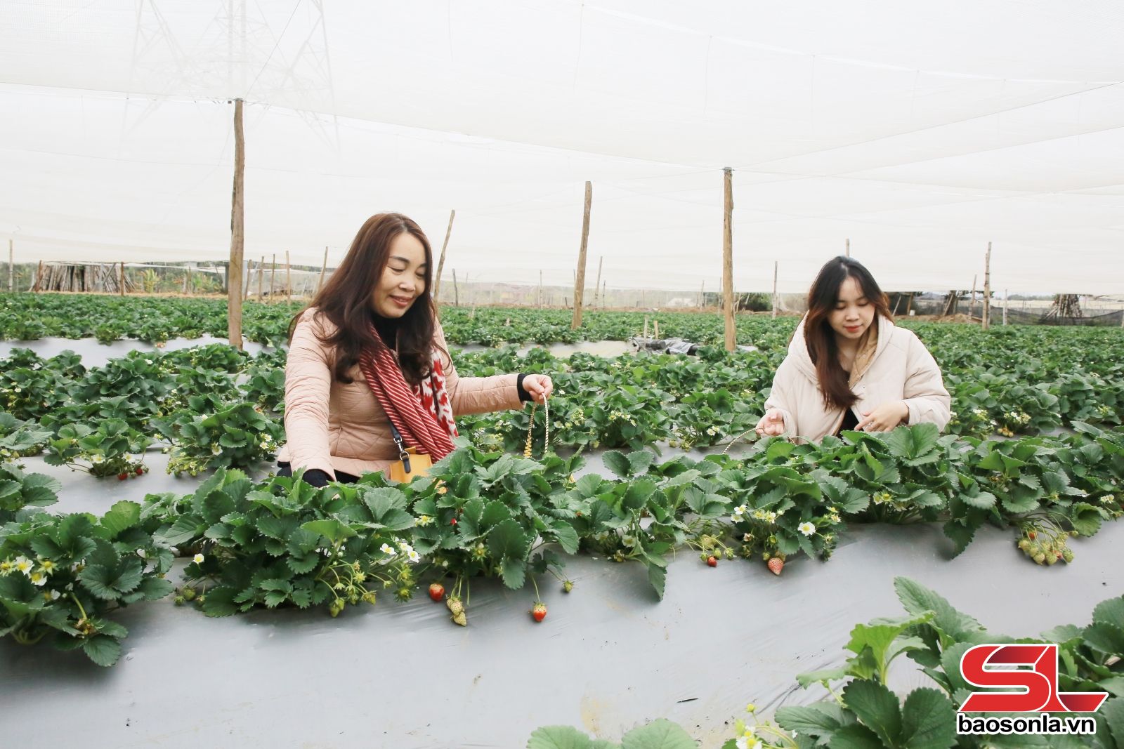 HTX Du lịch nông nghiệp Bon Bon, phường Mộc Châu, một trong những điểm đến quen thuộc của du khách khi nhắc tới du lịch nông nghiệp. Độc đáo là ở đây có nhiều loại cây trồng mới, như: Phúc bồn tử, sung Mỹ, cà chua trái cây Cherry, nho mẫu đơn, chanh leo Colombia, bí quả khổng lồ… Đặc biệt là có giống dâu tây Hana (Nhật Bản), dâu tây khổng lồ King Berry (Hàn Quốc), dâu tây bạch tuyết phấn trắng, bạch tuyết má hồng, dâu sky và Oishii (Nhật Bản)... Thời điểm này, dâu tây bắt đầu cho thu hoạch lứa quả đầu tiên, dù chưa rộ, nhưng chính sự khan hiếm và vị ngọt đậm đà của lứa quả đầu mùa, khiến du khách đến đây trải nghiệm vô cùng thích thú.