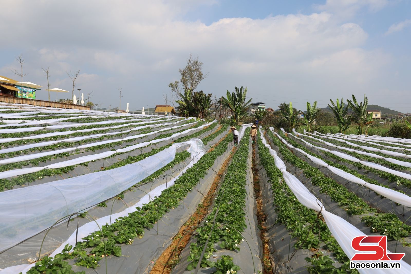 Để có được vườn dâu chín đỏ phục vụ du khách ngay từ tháng 12 dương lịch, HTX đã áp dụng quy trình kỹ thuật khắt khe, trồng dâu theo tiêu chuẩn VietGAP, đảm bảo sản phẩm quả dâu tây ngon, sạch, an toàn. Anh Lại Tuấn Việt, Quản lý nông trại Bon Bon Farm, HTX Du lịch nông nghiệp Bon Bon, thông tin: HTX có gần 2 ha trồng dâu tây. Để kịp phục vụ khách du lịch dịp Noel và Tết Dương lịch, chúng tôi xử lý đất và xuống giống từ tháng 9, trong quá trình chăm sóc, phân bón phải là loại phân vi sinh, phân hữu cơ kết hợp với phân chuồng để cung cấp đủ dinh dưỡng cho cây. Việc tưới nước thực hiện 2-3 lần/ngày, tùy vào thời tiết, đảm bảo cây luôn đủ ẩm. Trung bình 1 ngày, nông trại đang thu 50 kg dâu tây, chủ yếu phục vụ khách du lịch đến tham quan, trải nghiệm hái quả. Năm nay, HTX còn lựa chọn đưa vào trồng thử nghiệm, hướng đến mục tiêu, nông trại có dâu tây quanh năm phục vụ du khách mỗi dịp đến với Mộc Châu.
