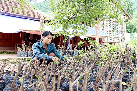 Người dân xã Chiềng Sơn (Mộc Châu) chăm sóc cây giống trước khi đem trồng.
