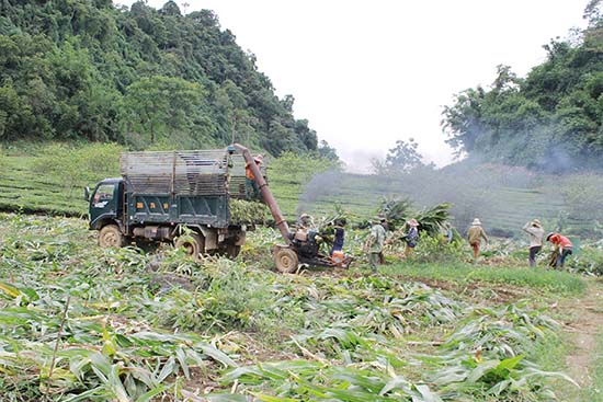 Trên con đường bê tông mới, những chuyến xe chở đầy cây ngô đã được băm nối đuôi nhau tỏa về những trang trại nuôi bò sữa. Đưa chúng tôi đi thăm những cánh đồng ngô đang thu hoạch của người dân trong xã, đồng chí Bàn Văn Lợi, Chủ tịch UBND xã Phiêng Luông, cho biết: 2 năm trở lại đây, nhận thấy nhu cầu làm ngô ủ ướp để cho bò sữa ăn tăng cao, xã đã vận động người dân chuyển đổi trồng từ ngô lấy bắp sang trồng ngô ủ ướp. Toàn xã hiện có trên 50 ha trông ngô ủ ướp được trồng nhiều nhất ở bản Piềng Sàng, với các giống ngô: GH9, NK54, NK67... đây là các giống ngô có ưu điểm cây cao, thân to, thời gian sinh trưởng ngắn, thích hợp với việc trồng lấy thân để làm ủ ướp.