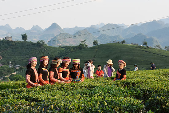 Du khách tham quan đồi chè tại Mộc Châu.