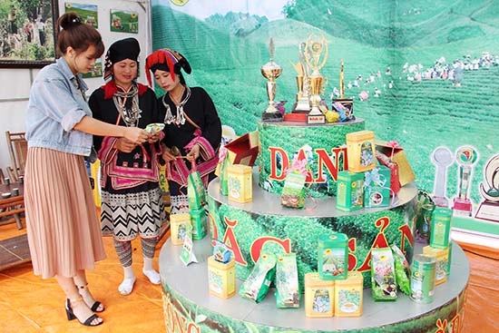 Du khách tham quan gian trưng bày giới thiệu sản phẩm chè Mộc Châu tại Ngày hội văn hóa các dân tộc huyện Mộc Châu năm 2017.
