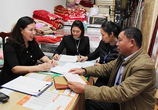 Cán bộ Đội thuế thị trấn Nông trường Mộc Châu tuyên truyền kết hợp kiểm tra việc chấp hành nghĩa vụ nộp thuế của hộ kinh doanh trên địa bàn.