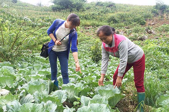 Cán bộ phụ nữ xã cùng chị Nguyễn Thị Hồng kiểm tra mô hình rau sạch của gia đình.