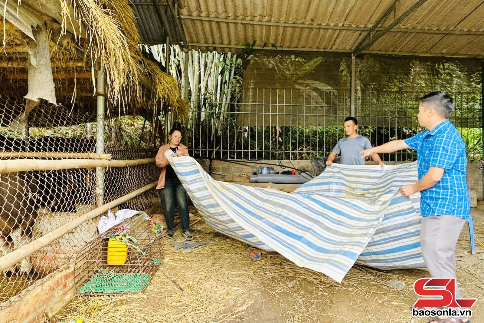 Cán bộ xã Chiềng La hướng dẫn người dân che chắn chuồng nuôi gia súc