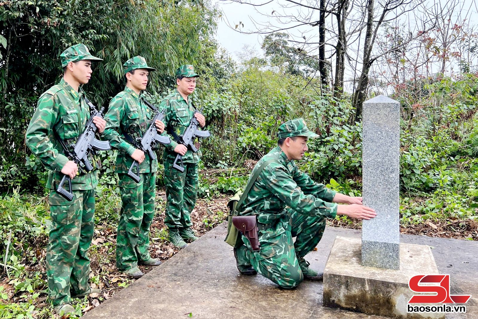 Cán bộ, chiến sĩ Đồn Biên phòng Chiềng Sơn tuần tra, kiểm tra cột mốc.