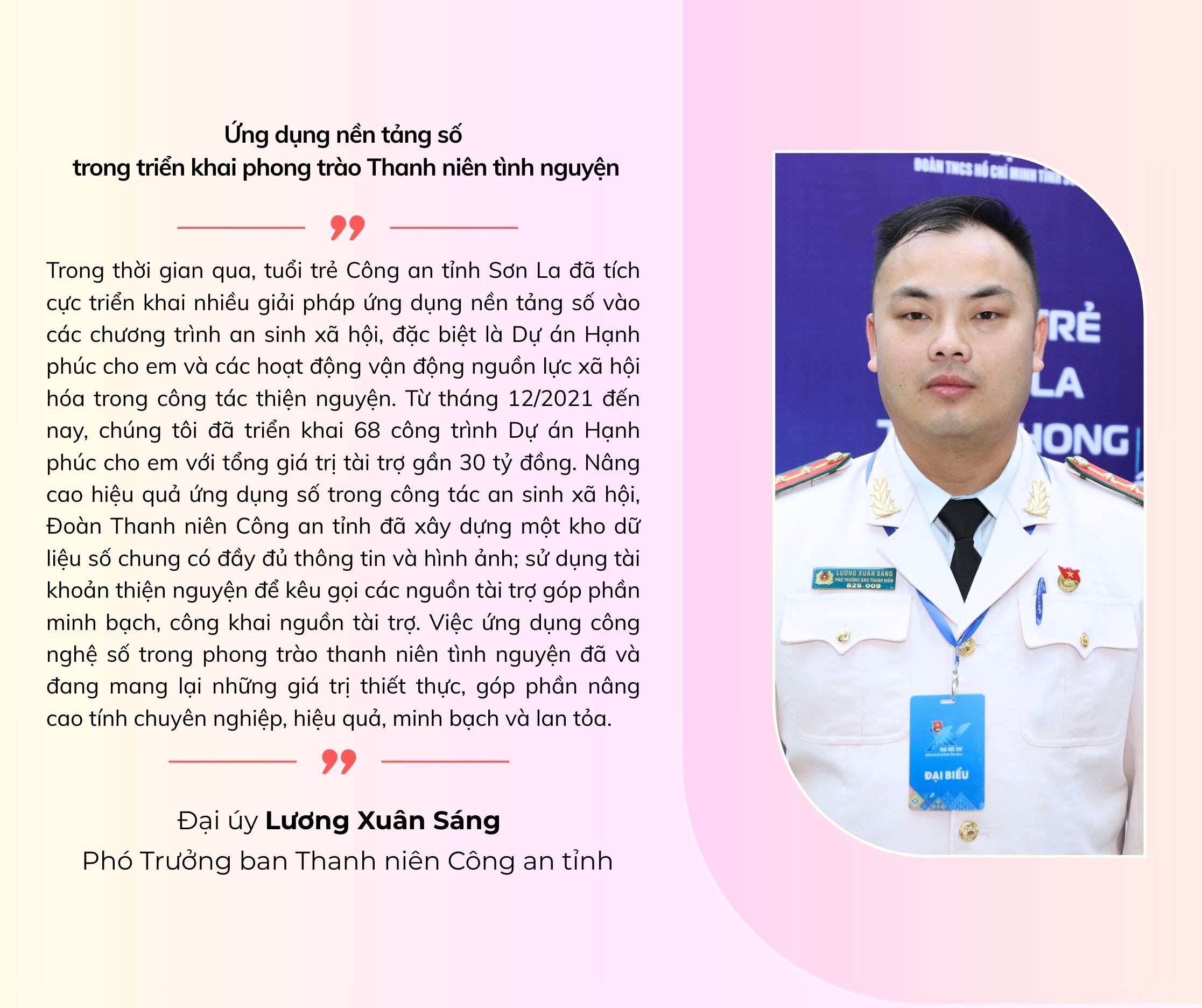 Nhiệm kỳ 2025 - 2030, các cấp bộ Đoàn tỉnh Sơn La xác định mục tiêu xây dựng thế hệ thanh niên phát triển toàn diện, có lý tưởng cách mạng, đạo đức, tri thức, sức khỏe, khát vọng vươn lên và tinh thần thượng tôn pháp luật; phát huy mạnh mẽ vai trò xung kích, sáng tạo của thanh niên trong chuyển đổi số, hội nhập quốc tế và phát triển kinh tế – xã hội. Công tác Đoàn tập trung thực hiện 3 nhiệm vụ đột phá: Đổi mới phương thức hoạt động phù hợp mô hình tổ chức mới; đẩy mạnh hỗ trợ thanh niên khởi nghiệp, đổi mới sáng tạo; nâng cao năng lực số, làm chủ khoa học công nghệ cho đoàn viên, thanh thiếu nhi. Đồng thời, tiếp tục triển khai hiệu quả các phong trào “Tuổi trẻ Sơn La tiên phong trong kỷ nguyên mới”, “Bình dân học vụ số”, “Thanh niên Sơn La làm giàu trên quê hương”, góp phần thực hiện mục tiêu phát triển xanh, nhanh và bền vững của tỉnh.