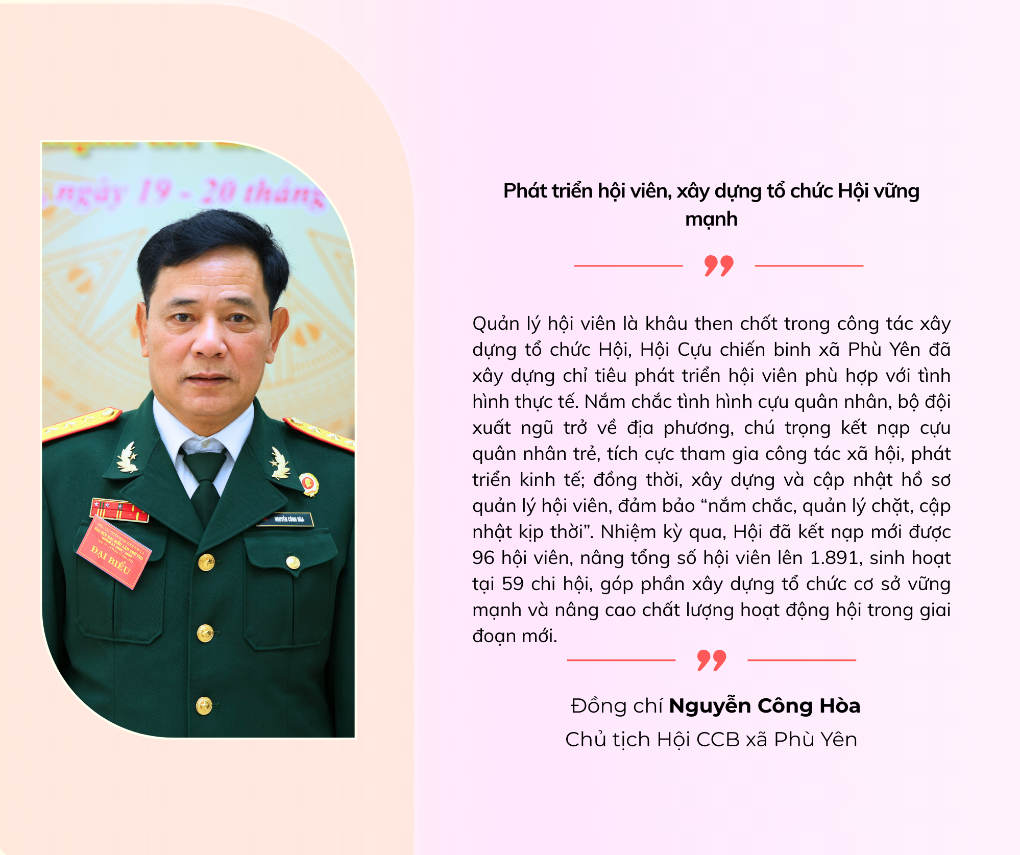 Trong nhiệm kỳ, đã kết nạp 3.078 hội viên mới; nâng tổng số hội viên toàn tỉnh lên 43.936 hội viên. Kết quả bình xét, xếp loại năm 2023, năm 2024, có 13/14 tập thể đạt 92,8% hoàn thành tốt nhiệm vụ; 1 tập thể hoàn thành xuất sắc nhiệm vụ; trên 90% số hội viên CCB gương mẫu; 99% số gia đình hội viên đạt danh hiệu “Gia đình văn hóa”.
