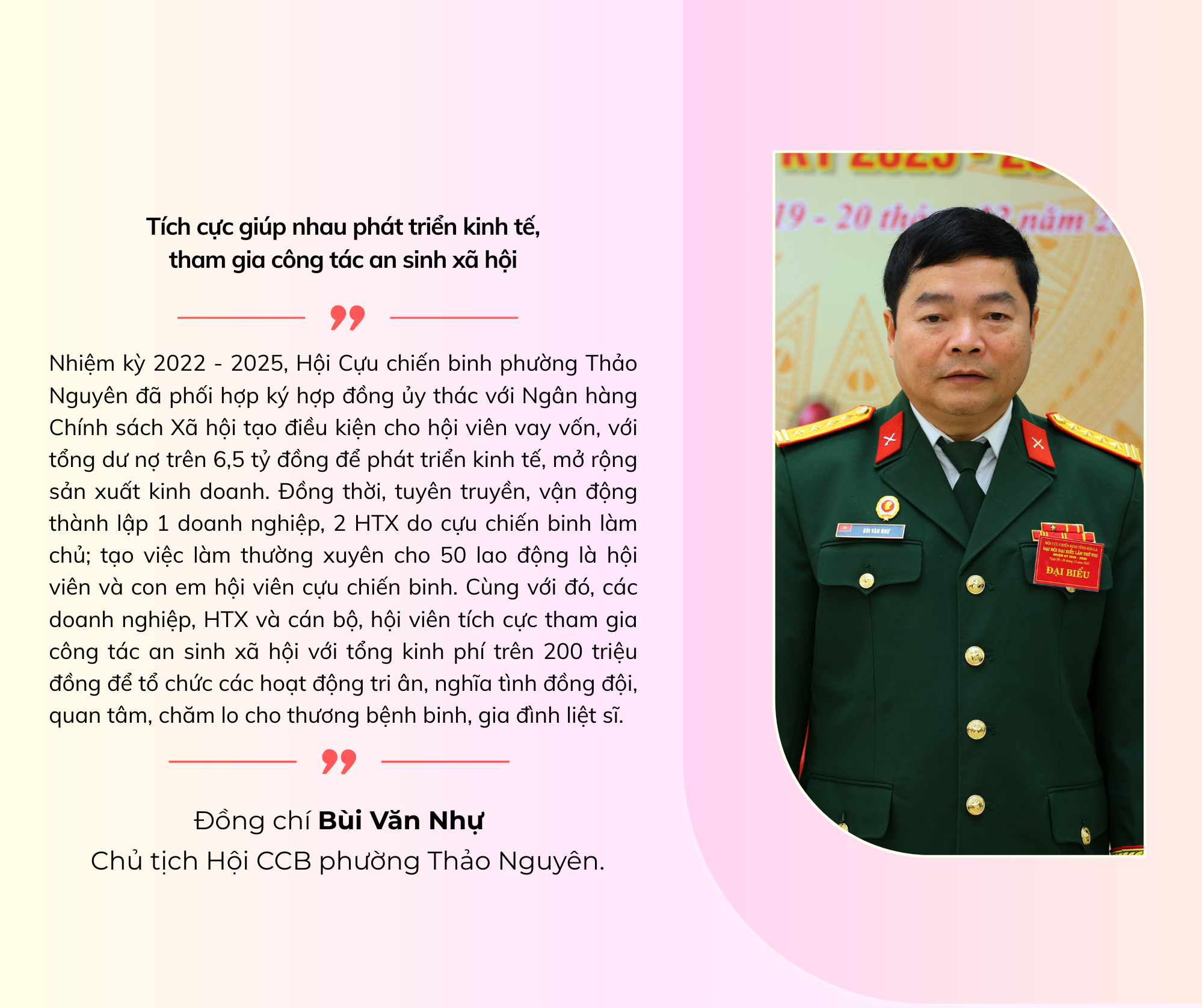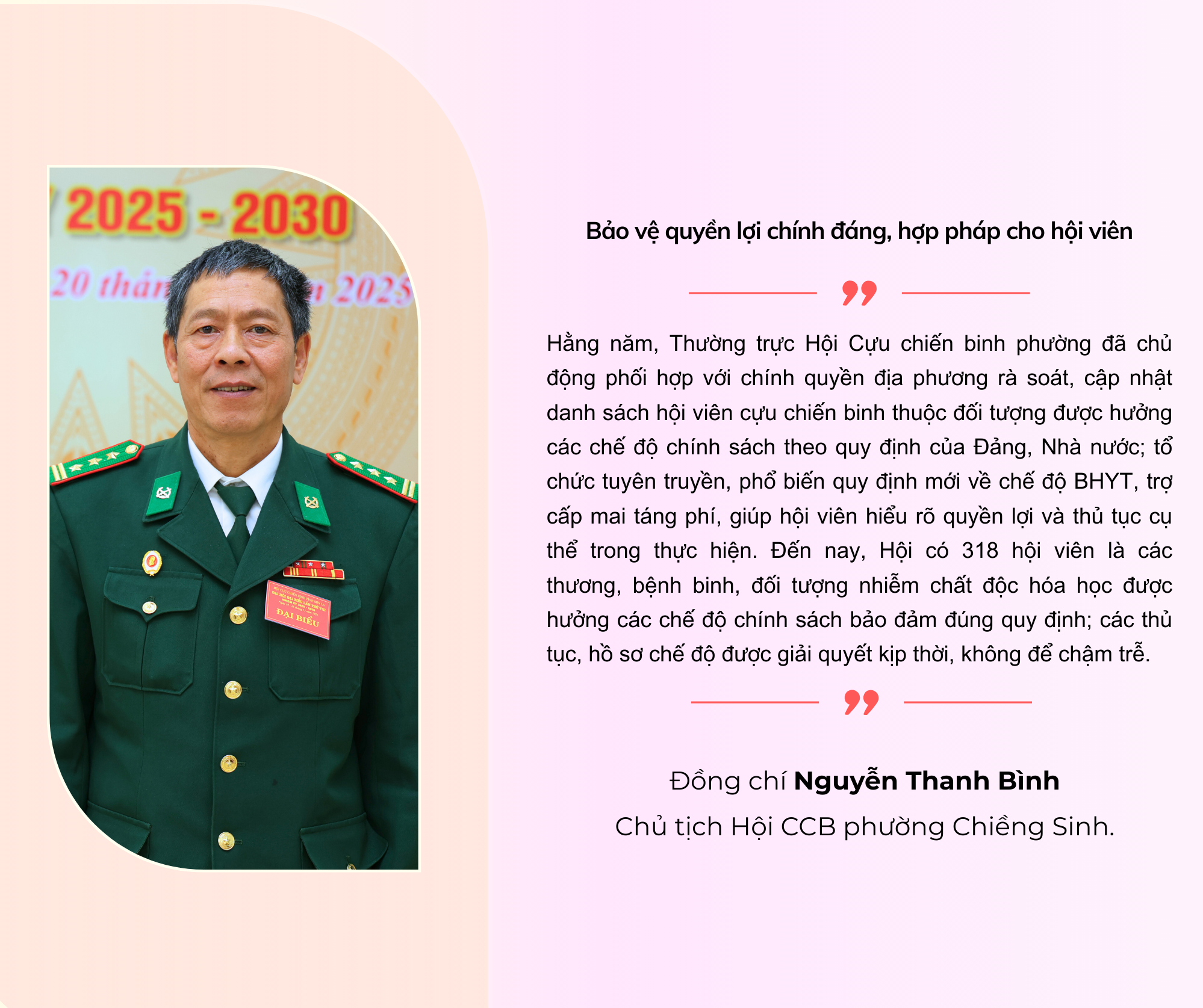 Từ ngày 1/7/2025, các cấp Hội CCB đã thực hiện sáp nhập vào Ủy ban MTTQ cùng cấp theo mô hình chính quyền địa phương 2 cấp. Các đơn vị được kiện toàn, đi vào hoạt động hiệu quả. Các phong trào, hoạt động hội được triển khai sâu rộng, tạo sức lan tỏa mạnh mẽ, tập hợp, thu hút và củng cố khối đoàn kết thống nhất trong toàn thể hội viên. Toàn Hội có 1.133 hội viên tham gia cấp uỷ Đảng; 483 cán bộ, hội viên là đại biểu HĐND các cấp nhiệm kỳ 2025-2030 (thời điểm sau sáp nhập).