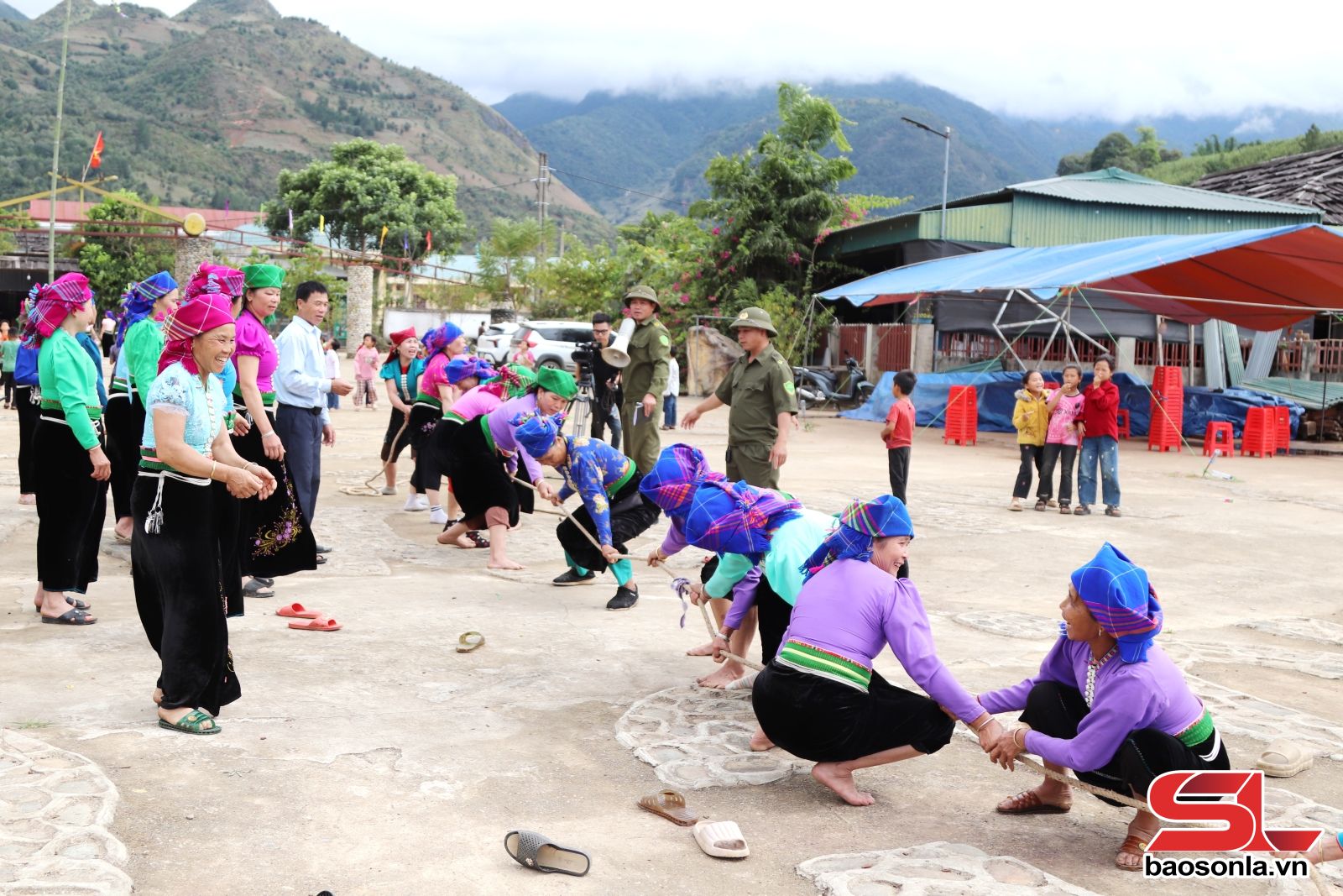 Nhân dân bản Mường Chiến hào hứng thi đấu môn kéo co tại Ngày hội