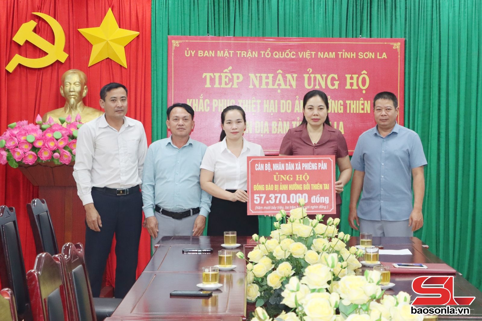 Với tinh thần chia sẻ, giúp đỡ, ngay sau khi MTTQ phát động, các cơ quan, đơn vị, doanh nghiệp từ tỉnh đến cơ sở đã kêu gọi cán bộ, công chức, viên chức, người lao động và nhân dân quyên góp tiền mặt, hiện vật và ngày công hỗ trợ đồng bào vùng lũ sớm ổn định cuộc sống.Từ đầu năm đến ngày 28/10, Ban Vận động cứu trợ tỉnh tiếp nhận trên 73 tỷ 600 triệu đồng qua tài khoản tại Kho bạc Nhà nước, tài khoản Ngân hàng NN&PTNT Việt Nam Chi nhánh Sơn La; 4.370 kg gạo; 295 thùng mỳ tôm; hơn 4.000 kiện sữa, nước ngọt các loại; 30 thùng bột giặt; 30 thùng nước rửa chén; 1 tấn và 10 thùng hóa chất (dùng khử nước sinh hoạt) hơn 100 bao quần áo các loại.