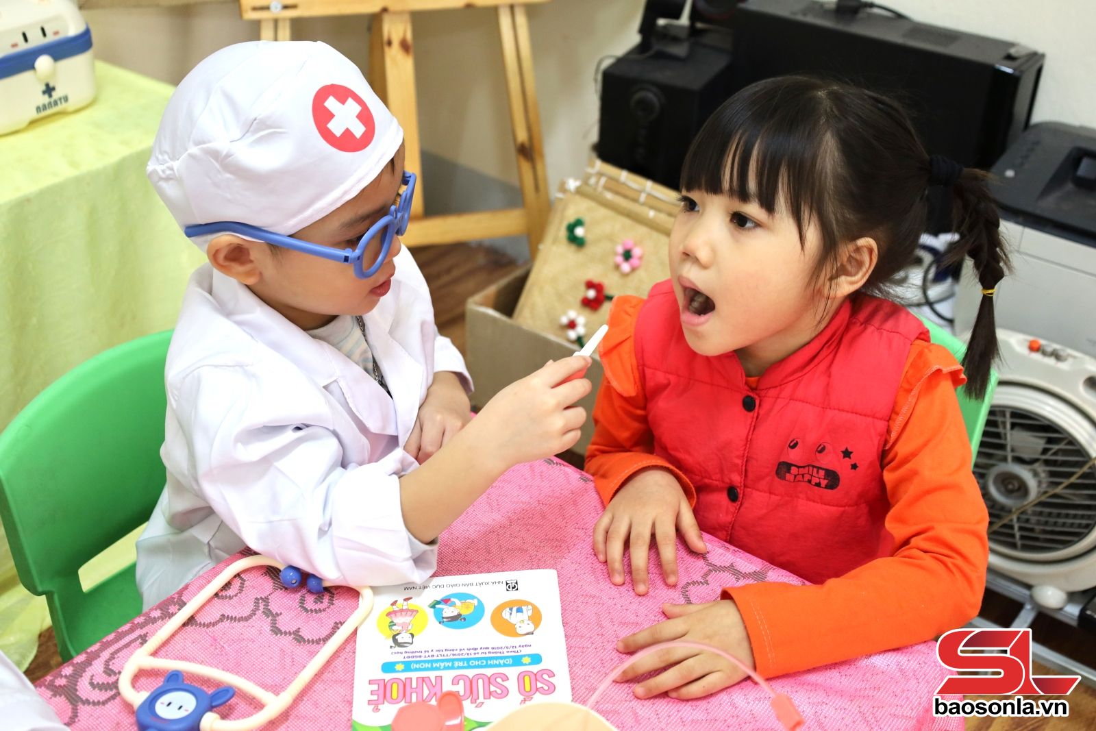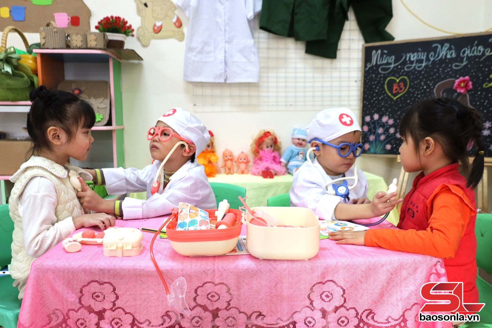 Giờ học trải nghiệm nghề nghiệp cũng thu hút rất đông các em tham gia. Tại góc "Bé tập làm bác sĩ", các em trẻ hóa thân thành bác sĩ, y tá để thực hành khám và chữa bệnh, giúp trẻ hiểu hơn về công việc của ngành y, giảm bớt sợ hãi khi đi khám bệnh, đồng thời nuôi dưỡng lòng kính trọng và yêu quý nghề bác sĩ. Bé Trần Minh Phúc hồn nhiên khoe: Con thích đi học lắm. Hôm nay con được đóng vai làm bác sĩ khám bệnh cho bạn. Lớn lên con cũng muốn trở thành bác sĩ để chữa bệnh cho mọi người.
