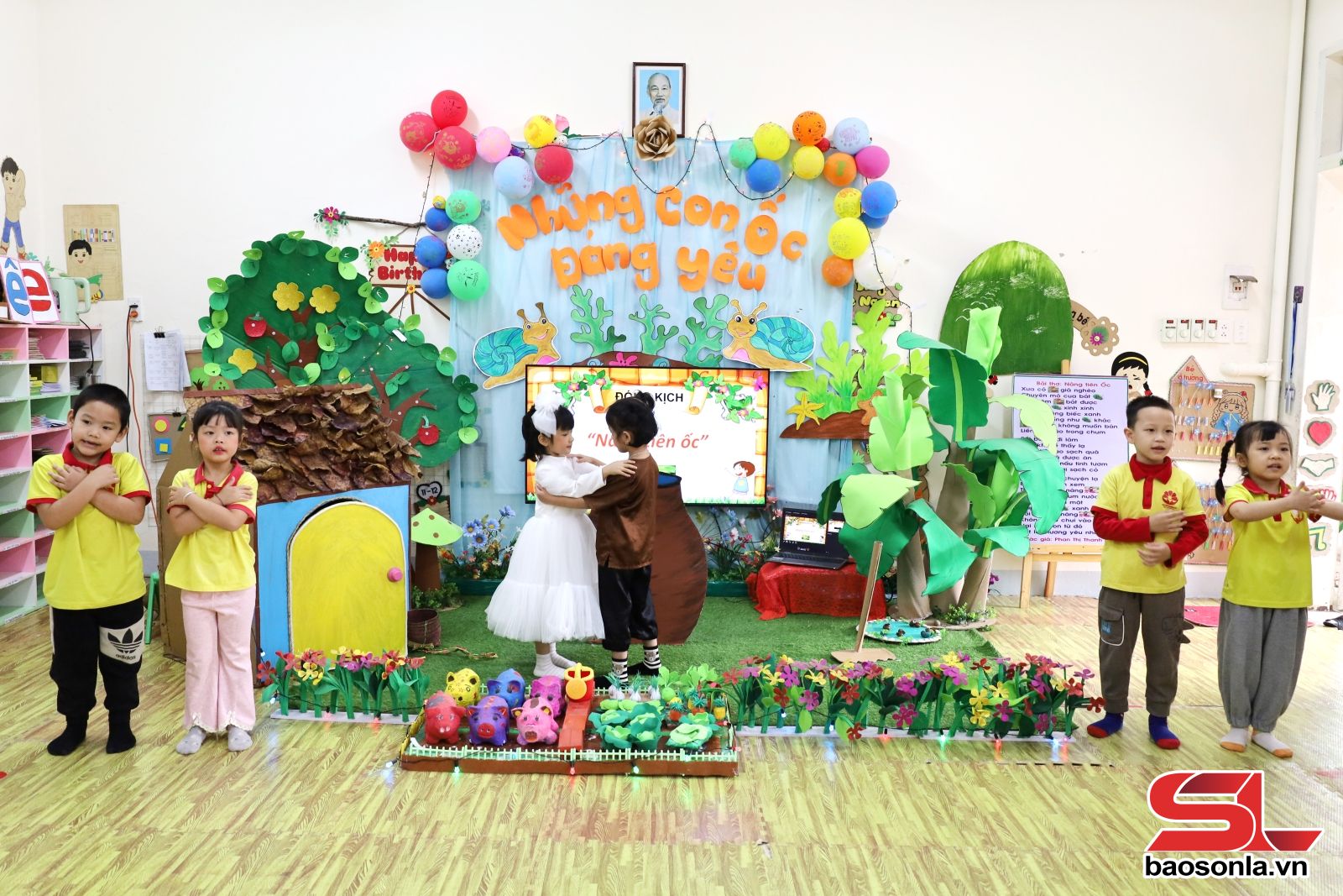 Còn tại lớp Mẫu giáo lớn A1, lớp học đã biến thành một sân khấu kịch thu nhỏ, các em đang tái hiện lại câu chuyện cổ tích "Nàng tiên ốc". Góc lớp được trang trí với những chậu cây, chiếc chum giả làm bằng giấy bồi, bé gái trong trang phục màu trắng, tay cầm vỏ ốc, e dè bước ra khỏi "vỏ" để quét nhà, nhặt rau giúp bà lão; còn một bé gái khác đóng vai bà lão, cẩn thận đập vỡ vỏ ốc với biểu cảm đầy yêu thương. Theo chia sẻ của các cô giáo, hoạt động sân khấu hóa các tác phẩm văn học là một trong những phương pháp hiệu quả để phát triển ngôn ngữ mạch lạc cho trẻ. Khi được hóa thân thành nhân vật, các em không chỉ nhớ câu truyện lâu hơn mà còn mạnh dạn, tự tin hơn trong giao tiếp. Đây là nền tảng quan trọng cho các kỹ năng xã hội sau này, bồi đắp tình yêu thương, lòng hiếu thảo và sự trân trọng các giá trị văn hóa dân gian.